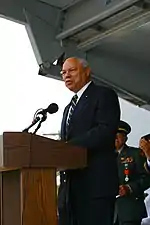 In his keynote address, Powell spoke of the Town of Tonawanda Veterans Memorial as a symbolic gesture of thanks to the military veterans it represents, and as a tool to educate youth on the meaning of military service.[3][16] He stressed the role of young people in society and acknowledged that it was a teenage Town of Tonawanda resident that initiated the grassroots effort to build the memorial, saying that "sometimes it is the youngest people in our community who understand what's important."[16] Powell further remarked that the memorial's location, in a public park and adjacent to a playground, means that it will be readily visible to local children and that "it will speak to them silently, but powerfully."[16] He also discussed his appreciation of military service throughout the history of the U.S. and of his own military service, including his time leading the Joint Chiefs of Staff.[16]