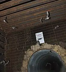 This bat requires large cavities for roosting; these may include abandoned buildings and mines, caves, and basal cavities of trees.[2] During summer, these bats inhabit rocky crevices, caves, and derelict buildings. In winter, they hibernate in a variety of dwellings, including rocky crevices, caves, tunnels, mineshafts, spaces under loose tree bark, hollow trees, and buildings.[6] During the summer, males and females occupy separate roosting sites; males are typically solitary, while females form maternity colonies, where they raise their pups. A maternity colony may range in size from 12 bats to 200, although in the eastern United States, colonies of 1,000 or more have been formed.[2] During the winter, these bats hibernate, often when temperatures are around 32 to 53 °F (around 0 °C to 11.5 °C.) Hibernation occurs in tightly packed clusters, which could possibly help stabilize body temperatures against the cold. Males often hibernate in warmer places than females and are more easily aroused and active in winter than females. The bats are often interrupted from their sleep because they tend to wake up frequently and move around in the cave or move from one cave entirely to another. Before hibernation, C. townsendii individuals increase their body mass to compensate for the food they do not eat during the winter.[2]