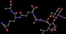 TCT is a soluble piece of peptidoglycan (PGN) found in the cell wall of all gram-negative bacteria.[4] Like all PGNs, TCT is composed of a disaccharide and a peptide chain. The IUPAC name for TCT is N-acetylglucosaminyl-1,6-anhydro-N-acetylmuramyl-(L)-alanyl-γ-(D)-glutamyl-mesodiaminopimelyl-(D)-alanine.[5] It is classified as a DAP (diaminopimelic acid)-type PGN due to the third amino group within the chain being a diaminopimelyl peptide.