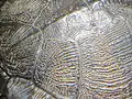 Adult male yellow-bellied sliders typically reach 5–9 inches (13–23 cm) in length; females range from 8–13 inches (20–33 cm).[6] The carapace (upper shell) is typically brown and black, often with yellow stripes. The skin is olive green with prominent patches of yellow down the neck and legs. As the name implies, the plastron (bottom shell) is mostly yellow with black spots along the edges. Adults tend to grow darker as they age.[7][8] Yellow-bellied sliders are often confused with eastern river cooters, who also have yellow stripes on the neck and yellow undersides, but the latter lack the green spots characteristic of this species. The yellow belly often has an "s"-shaped yellow stripe on its face. They also have markings shaped like question marks on their bellies. Females of the species reach a larger body size than the males do in the same populations.[9]