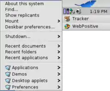 The Deskbar is a taskbar that is by default placed in the upper right corner of the screen of the Haiku operating system. It is composed of the deskbar menu, the tray (clock information panel) and the list of running programs. The Tracker is always shown on the top of the list of running programs.