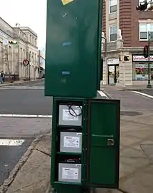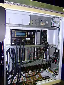 A traffic signal is typically controlled by a controller mounted inside a cabinet.[8] Some electro-mechanical controllers are still in use (New York City still had 4,800 as of 1998, though the number is lower now due to the prevalence of the signal controller boxes[9]). However, modern traffic controllers are solid state. The cabinet typically contains a power panel, to distribute electrical power in the cabinet; a detector interface panel, to connect to loop detectors and other detectors; detector amplifiers; the controller itself; a conflict monitor unit; flash transfer relays; a police panel, to allow the police to disable the signal; and other components.[8]