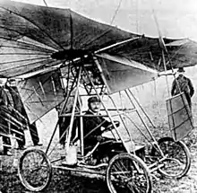 Traian Vuia or Trajan Vuia (Romanian pronunciation: [traˈjan ˈvuja]; August 17, 1872 – September 3, 1950) was a Romanian inventor and aviation pioneer who designed, built and tested the first tractor monoplane. He was the first to demonstrate that a flying machine could rise into the air by running on wheels on an ordinary road.[2] He is credited with a powered hop of 11 m (36 ft) made on March 18, 1906, and he later claimed a powered hop of 24 m (79 ft).[3][4] Though unsuccessful in sustained flight, Vuia's invention influenced Louis Blériot in designing monoplanes.[5] Later, Vuia also designed helicopters.