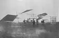 By December 1905 Vuia had finished construction of his first airplane, the "Vuia I". This was a high-wing monoplane constructed entirely of steel tubing. The basic framework consisted of a pair of triangular frames, the lower members forming the sides of the rectangular chassis which bore four pneumatic-tyred wheels, the front pair steerable. The wing was mounted on the apices of these frames and resembled those of Otto Lilienthal's gliders, with a number of curved steel tubes radiating outwards from centres at the apex of each of the side frames, braced by wires attached to a pair of kingposts, and covered in varnished linen. Pitch control was achieved by varying the angle of attack of the wing. A trapezoidal rudder was mounted behind and below the wing.[13] It was powered by a carbonic acid gas engine driving a single tractor propeller. The 25 hp engine had to be adapted by Vuia himself as a suitable engine was not available.[14] Liquid carbon dioxide was vaporized in a Serpollet boiler and fed to a Serpollet engine. The fuel supply was enough for a running time of about five minutes at full power.[15] The aircraft was constructed for Vuia by the Parisian engineering company of Hockenjos and Schmitt.