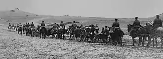A distinction was made between the general supply trains, which carried sustenance, ammunition and forage for the entire force, and an individual unit's baggage train, which carried a ready supply of ammunition, hospital stores, rations, forage and personal effects. While the size of the former varied on how many soldiers needed to be supported and was organized by division, restrictions were commonly placed on the latter. For example, prior to the start of the Army of the Potomac's Peninsula campaign, the limit was set at 4 wagons for every corps headquarters; 3 wagons for every division or brigade headquarters; 6 wagons for every full regiment of infantry; and 3 wagons for every squadron of cavalry or artillery battery.[8][9]