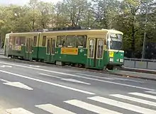 Beginning in 2013, HKL acquired 72 new Artic-trams. They have a double-articulated, eight-axle design, are 27.3 m (89 ft 7 in) long and have 74 fixed seats, 14 foldable seats and space for 75 standing passengers.[14] The design has a 100% low floor and conventional, turning bogies designed to run without problems on Helsinki's challenging old-fashioned track network.[15] Two prototype units were delivered in 2013, and each entered passenger service approximately two months after delivery. The first unit of the production series, no. 403, arrived in Helsinki in January 2016. The order is worth €113 million and it includes an option for a further 90 trams.