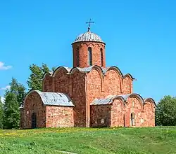 The church is constructed in brick, and has one dome.[2] It has a single apse and four square columns. This design is typical for pre-Mongol Novgorod churches. There are two auxiliary chapels of different size flanking the main building from the south and from the north. The south chapel has a set of limestone crosses inserted in the walls. The system of vault roofing features three semicircular wall gables (zakomara) which hark back to the pre-Mongol period. The pillars are square rather than circular or octagonal, as was typical for the 14th century.