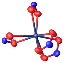 Several homoleptic (complexes with only one kind of ligand) complexes have been characterized by X-ray crystallography. The inventory includes octahedral complexes [M(NO2)6]3− (M = Co, Rh).[6][7] Square-planar homoleptic complexes are also known for Pt(II) and Pd(II). The potassium salts of [M(NO2)4]2− (M = An, Cd) feature homoleptic complexes with four O,O-bidentate nitrite ligands.[8]