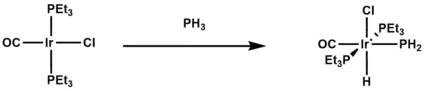 Another way to generate the transition-metal phosphido complexes are by direct activation of P-H bonds and is mostly seen in the late-transition-metal complexes. For example, the reaction of Vaska's complex analogs with the parent phosphine generate the following transition-metal phosphido complex.[5]