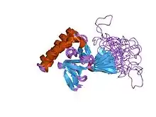 This structure has a very complex topology composed of four beta-sheets and three alpha helices.[5]