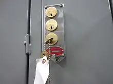 Some complex sequences use key exchange blocks or boxes, that allow alternative sequences of operation. Interlock devices may have an electrical solenoid which holds the key until an electrical circuit is interrupted; for example, the power supply for a high-voltage cabinet has been de-energized, releasing a key to allow access to the interior of the cabinet. Some interlocks include a time delay function or a rotation detector to ensure a machine has had time to come to a stop before allowing the next step of an interlock sequence to proceed.[4] A key exchange block may only hold and release keys and may not have a bolt to interlock process equipment, or may be part of the interlock of a particular machine or device.