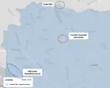 As an unincorporated area, Travilah's boundaries are not officially defined. However, the United States Census Bureau began recognizing a Travilah census-designated place (Travilah CDP) in the 2000 Census when the new Travilah CDP was created using portions of the Potomac and North Potomac CDPs.[3] According to the state of Maryland, "The boundaries for CDPs often are defined in partnership with state, local, and/or tribal officials and usually coincide with visible features or the boundary of an adjacent incorporated place or another legal entity."[4] The boundaries of the Travilah CDP are currently those used in the 2010 Census.[5] The Travilah CDP is surrounded by the Darnestown CDP, the North Potomac CDP, the city of Rockville, the Potomac CDP, and the Potomac River—and the old crossroads community of Travilah is located in the west central portion of the CDP.[5]