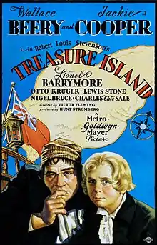 Treasure Island is a 1934 film directed by Victor Fleming and starring Wallace Beery, Jackie Cooper, Lionel Barrymore, Lewis Stone, and Nigel Bruce. It is an adaptation of Robert Louis Stevenson's famous 1883 novel of the same name. Jim Hawkins discovers a treasure map and travels on a sailing ship to a remote island, but pirates led by Long John Silver threaten to take away the honest seafarers’ riches and lives.