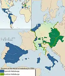 This division reflected the administrative complexity of managing the two empires as a single entity but also differences in their strategic objectives. While Spain was a global maritime superpower, the Austrian Habsburgs focused on securing a pre-eminent position in Germany and managing the threat posed by the Ottoman Empire.[3] A second area of divergence was how to respond to the Reformation and growth of Protestantism. In Germany, conflict between Lutheran and Catholic princes resulted in the 1552 Second Schmalkaldic War, settled by the 1556 Peace of Augsburg.[4] Unlike Ferdinand, who favoured compromise with his Protestant subjects, Charles and his son Philip responded to the simultaneous rise of Calvinism in the Spanish Netherlands with repression, a policy that eventually led to the outbreak of the Dutch War of Independence in 1568.[5]