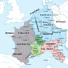 ![]() Division of the Frankish Empire after the Treaty of Ribemont in 880.