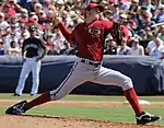 Bauer entered the 2012 season as the Diamondbacks' top-rated prospect, and the ninth overall prospect in MLB. He received an invitation to the Diamondbacks' spring training and went 1–0 with a 3.60 ERA in 10 Cactus League innings. Ultimately, however, Bauer failed to displace Josh Collmenter in Arizona's starting rotation, and he was assigned to Mobile shortly before opening day.[22] He made eight more starts for Mobile, going 7–1 with a 1.68 ERA and striking out 60 batters in 48+1⁄3 innings before receiving a promotion to the Triple-A Reno Aces on May 17. At the time of his promotion, he led the Southern League in wins, strikeouts, and ERA.[23] Bauer was selected to pitch in the 2012 All-Star Futures Game, but he was unavailable due to a major league call-up and had to be replaced by Tyler Skaggs.[24] At the time, he had a combined 11–1 record and 2.23 ERA between Reno and Mobile.[25]