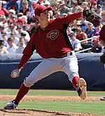 On June 27, 2012, the Diamondbacks called Bauer up from Reno in order to replace an injured Joe Saunders. He was scheduled to start the next day, becoming the first member of the 2011 draft class to make his MLB debut.[25] Although the Diamondbacks defeated the Atlanta Braves 3–2, Bauer earned a no decision in his major league debut, pitching four innings before suffering a groin strain that required him to leave the mound.[26] He picked up his first win on July 8, holding the Los Angeles Dodgers to six scoreless innings as the Diamondbacks ultimately won 7–1.[27] After four major league starts, during which Bauer went 1–2 with a 6.06 ERA, he was sent back down to Reno, where he was shut down for a period of two weeks in order to preserve his health during his first full season of professional baseball.[28] He finished the season there, helping the Aces to reach their first Pacific Coast League and Triple-A baseball championships. In the championship game against the Pawtucket Red Sox of the International League, Bauer took another no decision as he allowed two runs in 4+2⁄3 innings.[29] In 14 total starts for Reno, Bauer posted a 5–1 record and a 2.85 ERA, striking out 97 batters in 82 innings.[21]