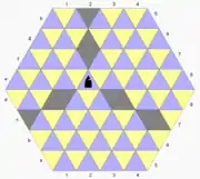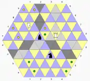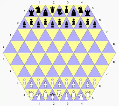 Triangular chess is a chess variant for two players invented by George R. Dekle Sr. in 1986.[1][2] The game is played on a hexagon-shaped gameboard comprising 96 triangular cells. Each player commands a full set of chess pieces in addition to three extra pawns and a unicorn.