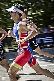 A trisuit is a single skin tight item of clothing designed specifically for triathlon athletes to provide comfort and remove the necessity to change clothing while switching from swimming to cycling to running.[1] Normally a trisuit is a single item of clothing; however, two-piece versions exist with separate shorts and top. These are mainly chosen for longer races where comfort is more important.[2] All trisuits have a cycling chamois built in for comfort on the bike leg of the competition. However, these are thinner than traditional shorts for cycling to allow the wearer to run without additional friction.[3] Traditionally, trisuits have no sleeves to allow for greater shoulder mobility for swimming, but trisuits with tight-fitting sleeves have become more popular recently. The material of a trisuit is important, as athletes will go from swimming to cycling, the clothing needs to be quick-drying so as to be comfortable for the majority of the cycling. The material also needs to be wicking or breathable, as cycling and running are sweat-producing activities and the trisuit is tight-fitting.[3]