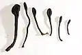 Trichoglossum hirsutum makes a black club shaped fungus 3–8 cm high. The cap is usually 1–2 cm tall.[1] The spores are produced on the enlarged upper part, which is 5–8 mm wide, up to 2 cm high, flattened, spearhead-shaped to ellipsoid and finely velvety. The flesh is thin, tough and brownish. The stem is up to 6 cm long and 1–4 mm thick, cylindrical and velvety.[1] Spores are 80–195 x 5–7 micrometers, cylindric-clavate, broadest in the middle and tapering to the blunt ends, with 15 septa. The asci each have 8 spores. The paraphyses are brown, cylindrical and coiled at the tips.[2]