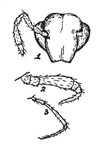 | Head (1), enlarged 6th leg (2), and normal leg (3) of a male T. whitei | |