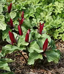 Scape erect, 28–44 cm (11–17 in) long, usually 2.3–2.5 times as long as the bracts. Bracts sessile, ovate or widely ovate, 11–18 cm (4.3–7.1 in) long, dark green, with tips generally slightly acuminate. Sepals lanceolate, 42–70 mm (1.7–2.8 in) long, diverging, greenish or basally purple. Petals oblanceolate, 65–105 mm (2.6–4.1 in) long, usually 3.3–4.6 times longer than wide, erect, dark purple (variously referred to as maroon-red, red-purple, purple-red, or lurid purple), underside usually duller than the top. Stamens erect, 16–25 mm (0.63–0.98 in) long; filaments short, dark purple; anther sacs introrse, 14–21 mm (0.55–0.83 in) long, with yellow pollen; connectives prolonged up to 0.5 mm. Carpels approximately 4/5 as tall or equal to the stamens; ovary ovoid, 9–13 mm (0.35–0.51 in) tall, dark purple, a rounded hexagon in cross section; stigmas coarsely subulate, 6–8 mm (0.24–0.31 in) long, erect, dark purple. Flowers have a spicy or musty odor at anthesis, sometimes becoming fetid with age. Fruit dark reddish purple, ovoid to ellipsoid, weakly angled, 20–50 mm (0.79–1.97 in), fleshy.[4][5][6]