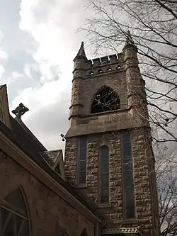The Gothic Revival style building is composed of rusticated limestone. A three-story bell tower is on the west end of the building and the apse is on the east. Because the church is built into the side of a hill both the upper and lower levels of the building open onto the ground level. The church features Gothic arch windows and doors throughout. Buttresses are placed between the windows on both sides of the building. It is considered an excellent example of late 19th century Gothic Revival ecclesiastical design.[4]