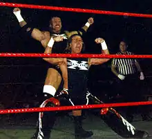 In early 1994, Levesque signed a one-year contract with World Championship Wrestling (WCW).[17][23] In his first televised match, Levesque debuted as a villain named Terror Risin', defeating Keith Cole. His ring name was soon modified to Terra Ryzing, which he used until mid-1994, when he was renamed Jean-Paul Lévesque.[6][24] This gimmick referred to his surname's French origins and he was asked to speak with a French accent, as he could not speak French.[25] During this time, he began using his finishing maneuver, the Pedigree. Lévesque had a brief feud with Alex Wright that ended at Starrcade[6] with Wright pinning him.[26] Between late 1994 and early 1995, Lévesque briefly teamed with Lord Steven Regal, whose upper class British persona was similar to Lévesque's character.[24] The team was short-lived. Lévesque had previously met with Vince McMahon to discuss jumping to the World Wrestling Federation which did not result in his working for the company. After McMahon watched Lévesque's Starrcade match, an employment offer was made and Levesque left for the WWF in January 1995.[27]
