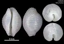 Trivirostra hyalina is a species of small sea snail, a marine gastropod mollusk in the family Triviidae, the false cowries or trivias. They are white in colour.[2]