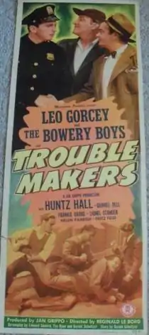 Trouble Makers is a 1948 comedy film directed by Reginald LeBorg and starring The Bowery Boys. The film was released in 1948 by Monogram Pictures, although the exact release date is uncertain, although two possible released dates are mentioned in different books, December 10, 1948[1] and December 26, 1948.[2] It is the twelfth film in the series.