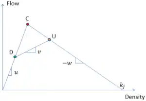 Laval's solution could be summarized as follows: Assuming a one-lane freeway segment obeying the triangular fundamental diagram defined in the figure to the right with free-flow speed u, wave velocity w and jam density kj. Only one truck type is considered. In this scenario, the normalized capacity I of the freeway segment is given as: