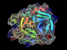 Trypsin (EC 3.4.21.4) is a serine protease from the PA clan superfamily, found in the digestive system of many vertebrates, where it hydrolyzes proteins.[2][3] Trypsin is formed in the small intestine when its proenzyme form, the trypsinogen produced by the pancreas, is activated. Trypsin cuts peptide chains mainly at the carboxyl side of the amino acids lysine or arginine. It is used for numerous biotechnological processes. The process is commonly referred to as trypsin proteolysis or trypsinization, and proteins that have been digested/treated with trypsin are said to have been trypsinized.[4] Trypsin was discovered in 1876 by Wilhelm Kühne and was named from the Ancient Greek word for rubbing since it was first isolated by rubbing the pancreas with glycerin.[5]