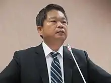 The Kaohsiung Incident occurred while Tsai served in the Republic of China Armed Forces. After his discharge from the military, Tsai advocated for the further democratization of Taiwan. He was elected to the Puli township council in 1984, and joined the Democratic Progressive Party in 1987 upon the lifting of martial law and assorted restrictions on opposition parties. Tsai was later elected to the Nantou County Council and worked for legislator Hsu Jung-shu before his 1995 election to the Legislative Yuan.[1] Tsai had become the chief executive of the DPP caucus by 2001,[2] rising to caucus whip by 2004.[3] In 2005, Tsai briefly resigned from the legislature to run for Nantou County Magistrate.[1] Starting in 2006, Tsai was the party's spokesman and deputy secretary general.[4][5][6][7] As a legislator, Tsai participated in many discussions pertaining to national defense and has served on the Foreign Affairs and National Defense Committee.[8][9][10][11][12] In 2010, Tsai aided a Taiwanese man in processing a relinquishment of Bolivian nationality, so he could pursue a military career.[13] The next year, Tsai was one of many DPP politicians to openly accuse China of interfering in Taiwan's elections.[14] After an influx of cheap hairy crabs to the Taiwanese market in 2012, Tsai led calls to investigate the quality of all imported hairy crabs.[15] Later that year, Tsai criticized the United States for linking its beef imports to the Trade and Investment Framework Agreement discussions.[16] In 2013, Tsai planned to contest the Nantou County magistracy for the second time,[17] but later ended his campaign.[18] As the 2014 Taiwan food scandal unfolded, Tsai berated the Ministry of Justice for ineffectiveness in handling related cases.[19] In 2016, he was invited to serve on the New Southbound Policy committee.[20]