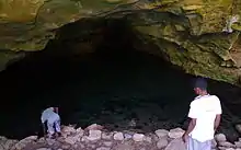 Continuing past the baobabs, the trail leads to the Banyan Tree site. This is a classic vertical sink hole, about 25 m in circumference resulting from the collapse of a cave. About 10 to 12 m below the rim of the sink hole is a pool and growing at the edge of the sinkhole, with roots reaching down into the water is a large banyan fig tree. Fossils have also been found here, showing a cross-section of the known extinct fauna found in the region.[11]