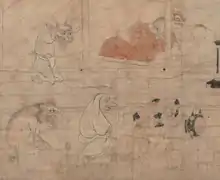 The pictures in Tsuchigumo Sōshi are traditionally attributed to the artist Tosa Nagataka (土佐 長隆),[1] who is also credited with the famous Illustrated Account of the Mongol Invasion,[2] while the text is traditionally attributed to the Buddhist teacher Kenkō,[1] famed for his Essays in Idleness.[3] While these attributions are uncertain,[lower-alpha 1] the scroll itself is generally dated to the early 14th century, or the latter part of Japan's Kamakura period.[7]