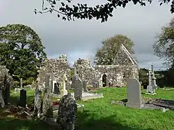 The present ruins date from various periods. Part of the east wall is from the 12th century, while the chancel dates back to the 15th century. There is also an 8th-century inscribed cross slab, dedicated to St Berechert.[4]
