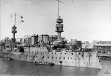 Steel warships of the early 1880s demonstrate tumblehome. France particularly promoted the design, advocating it to reduce the weight of the superstructure and increase seaworthiness by creating greater freeboard.[2] A French yard was contracted to construct the pre-dreadnought battleship Tsesarevich along the lines of France's Jauréguiberry, which was delivered to the Russian Imperial Navy in time for it to fight as Admiral Wilgelm Vitgeft's flagship at the Battle of the Yellow Sea on 10 August 1904. The Russo-Japanese War proved that the tumblehome battleship design was excellent for long distance navigation, but could be dangerously unstable when watertight integrity was breached.[3] Four tumblehome Borodino-class battleships, which had been built in Russian yards to Tsesarevich's basic design, fought on 27 May 1905 at Tsushima. The fact that three of the four were lost in this battle resulted in the discontinuing of the tumblehome design in future warships for most of the 20th century.