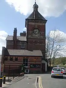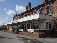 The imposing two-storey main station building was most likely designed by the LBSCR's Chief Engineer, F. Dale Bannister, who was responsible for other stations on the line. Called the "St. Pancras of the Weald"[4] by the Wealden Line Campaign, it was a statement of intent to local inhabitants by the LBSCR which was establishing the limits of its territory.[5] The station is composed of a central block flanked on the western side by a gable-fronted wing, and on the eastern side by a three-storey clocktower with a pyramidal slate roof surrounded by a louvred cupola with a weathervane. The facade of the building is constructed of red brick with ashlar and black brick dressings; on the ground floor level are a series of nine round-arched windows and an arched doorway, with a decorated ashlar impost band connecting the windows. The eaves are serrated with an ashlar cornice. Inside the building was a gas-lit booking hall with four ticket windows and a panelled ceiling supported by arches springing from stone columns.[6]