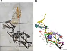 Tupandactylus imperator is known from four nearly complete skulls. The holotype specimen is MCT 1622-R, a skull and partial lower jaw, found in the Crato Formation, dating to the boundary of the Aptian-Albian stages of the early Cretaceous period, about 112 Ma ago.[1] It was initially described as a species of Tapejara,[2] but later research has indicated it warrants its own genus. The skull was toothless and had a prominent sagittal crest, only the base of which was bony: the front of the crest featured a tall bony rod extending up and back, and the rear of the crest had a long prong of bone projecting behind it. The bulk of the crest was made up of soft tissue similar to keratin, supported by the two bony struts.[3] An additional skull described in 2011, specimen CPCA 3590, preserved more of the lower jaw, showing that like Tapejara, T. imperator had a large, asymmetrical "keel"-like crest on the underside of the lower jaw tip.