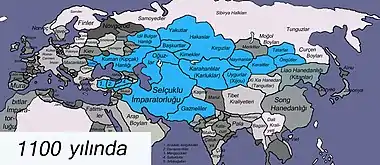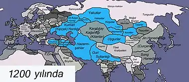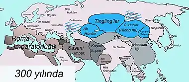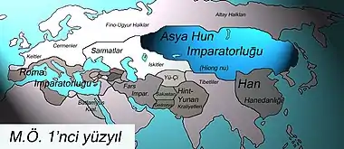 Most scholars believe that the Turks first appeared on the stage of history as a political community during the reign of the Huns (Hiung-nu or Shiongnu).[1][2][3][4] Although there are debates about its beginning, the history of the Turks is an important part of world history. The history of all people that emerged in Eurasia and North Africa has been affected by the movements of the Turks from afar and close. Turks also played an important role in bringing Eastern cultures to the West and Western cultures to the East. Their own religion became the pioneer and defender of the foreign religions they adopted after Tengrism, and they helped their spread and development (Mani religion, Judaism, Buddhism, Orthodox, Nestorian Christianity and Islam).