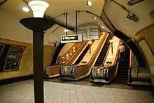 The sub-surface areas are tiled in biscuit coloured tiles lined with yellow friezes. The booking hall is 12 feet (3.7 metres) below street level.[6] In common with Manor House and Wood Green, the station tunnels have a diameter of 23 feet (7 metres) and were designed for the greater volume of traffic expected. Bounds Green and Southgate have only 21-foot (6.4 metres) diameter platform tunnels. The construction of "suicide pits" between the rails was also innovative. These were built in connection with a system of passageways under the platforms to give access to the track.
