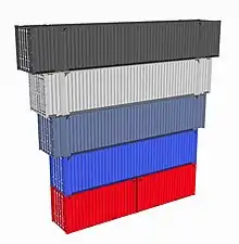 The standard intermodal container is designated as twenty feet long (6.1 m) and 8 feet (2.44 m) wide.[1] Additionally there is a standard container with the same width but a doubled length of forty feet called a 40-foot (12.2 m) container, which equals one forty-foot equivalent unit (often FEU or feu) in cargo transportation (considered to be two TEU, see below).