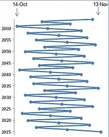 They are observed on the first and the second day following the occurrence of the eighth new moon after Naw-Rúz, as determined in advance by astronomical tables using Tehran as the point of reference.[4] This results in the observance of the Twin Birthdays moving, year to year, within the months of Mashíyyat, ʻIlm, and Qudrat of the Baháʼí calendar, or from mid-October to mid-November in the Gregorian calendar.[5]