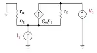 Note: Tabulated formulas in Table 3 make the g-equivalent circuit of the transistor from Figure 8 agree with its small-signal low-frequency hybrid-pi model in Figure 9. Notation: rπ is base resistance of transistor, rO is output resistance, and gm is mutual transconductance. The negative sign for g12 reflects the convention that I1, I2 are positive when directed into the two-port. A non-zero value for g12 means the output current affects the input current, that is, this amplifier is bilateral. If g12 = 0, the amplifier is unilateral.