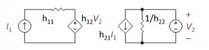 Figure 6: H-equivalent two-port showing independent variables I1 and V2; h22 is reciprocated to make a resistor