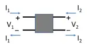 A two-port network (a kind of four-terminal network or quadripole) is an electrical network (circuit) or device with two pairs of terminals to connect to external circuits. Two terminals constitute a port if the currents applied to them satisfy the essential requirement known as the port condition: the electric current entering one terminal must equal the current emerging from the other terminal on the same port.[1][2] The ports constitute interfaces where the network connects to other networks, the points where signals are applied or outputs are taken. In a two-port network, often port 1 is considered the input port and port 2 is considered the output port.