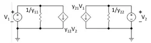 Figure 8: G-equivalent two-port showing independent variables V1 and I2; g11 is reciprocated to make a resistor