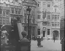 A young boy and his sister see a motor-car ready to depart in front of their house. They hook their little cart to the back of it, step in and drive along until they reach the Place Royale (English: Royal Square), with the statue of Godfrey of Bouillon in its center and the Palais de Justice (English: Law Courts of Brussels) in the background. From there, they walk on to visit the Grand Place and watch the Manneken Pis being dressed.