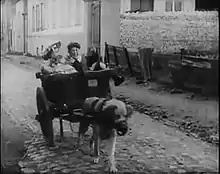 A new tram ride take the children to the outskirts of Brussels where they see a milkmaid delivering milk with her dogcart. They wait until the dogcart is left unattended, remove the milk cans, climb aboard and happily set off for a ride.[2]