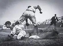 On May 12, 1911, playing against the New York Highlanders, he scored from first base on a single to right field, then scored another run from second base on a wild pitch. In the seventh inning, he tied the game with a two-run double. The Highlanders catcher vehemently argued the safe call at second base with the umpire in question, going on at such length that the other Highlanders infielders gathered nearby to watch. Realizing that no one on the Highlanders had called time, Cobb strolled unobserved to third base, and then casually walked towards home plate as if to get a better view of the argument. He then suddenly broke into a run and slid into home plate for the eventual winning run.[5] It was performances like this that led Branch Rickey to say later that Cobb "had brains in his feet."[68]